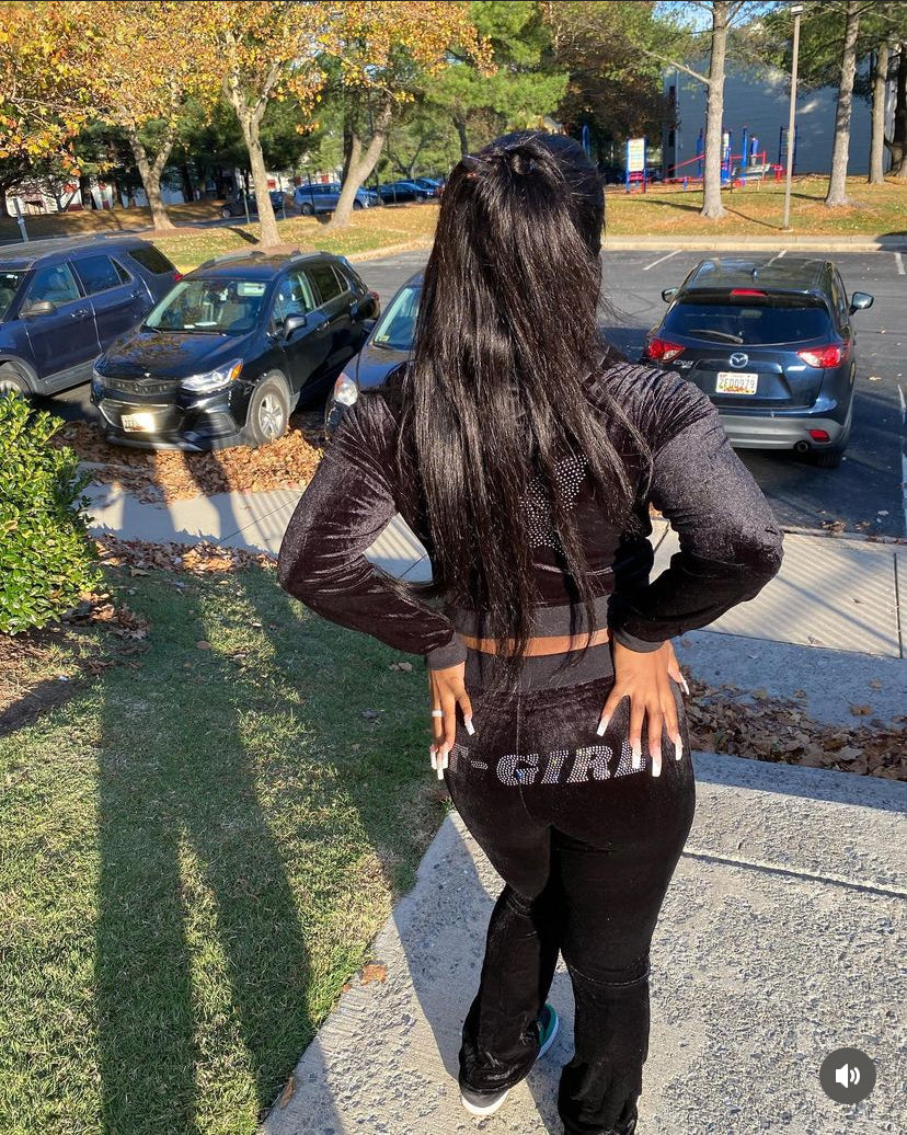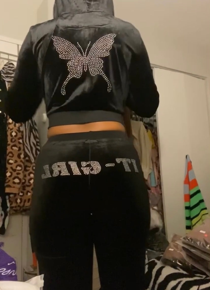 Our official velour sweatsuit! These sweatsuits have “It-Girl” on the butt of the sweatpants with the matching long sleeve jacket. This sets’ jacket comes WITHOUT a hood and WITHOUT name on hood.