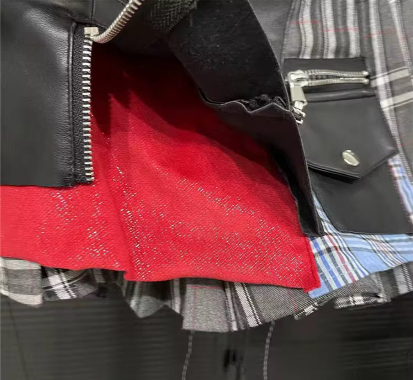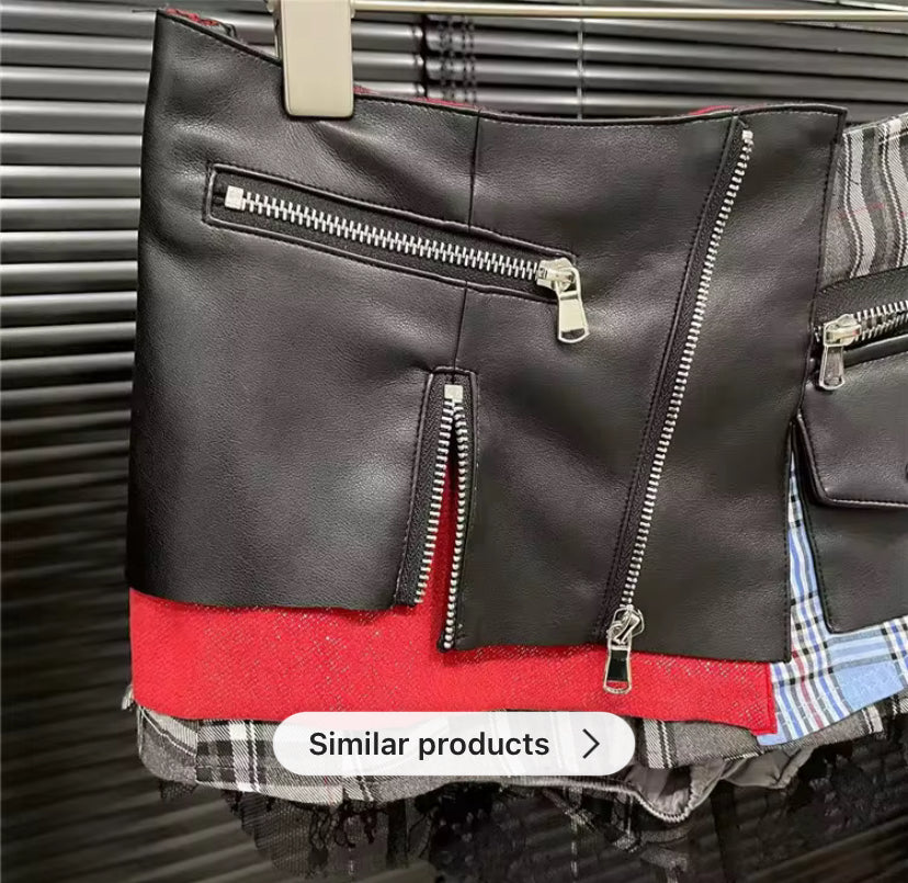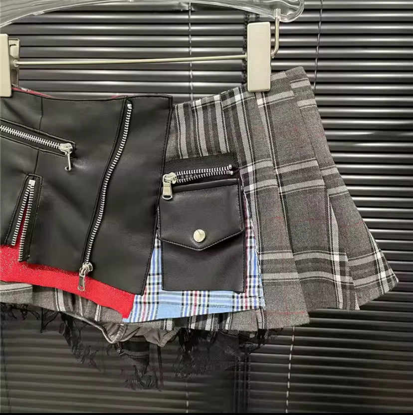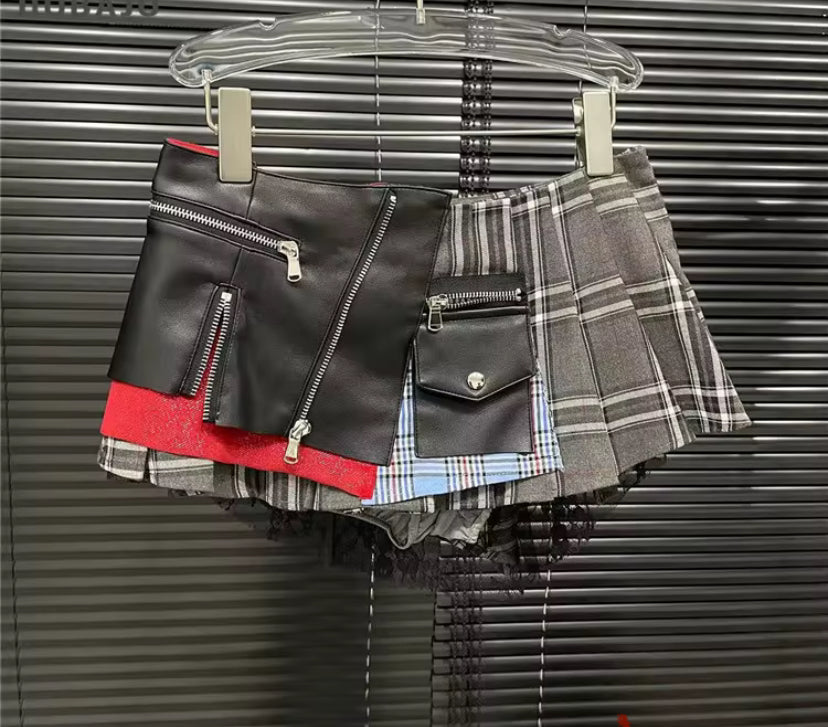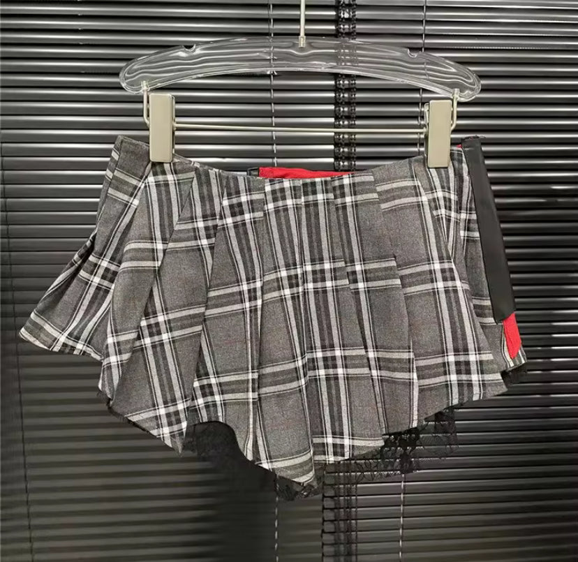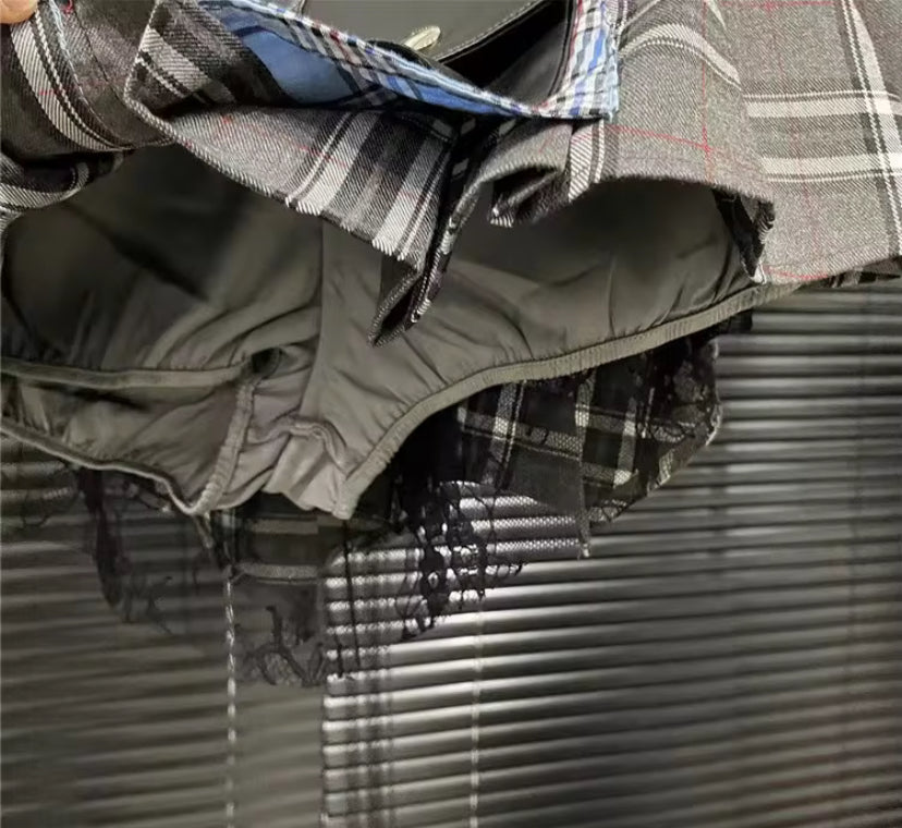 This skirt is a mash up between punk rocker and school girl. This skirt comes with panties/shorts underneath but still gives a little cheek-from different angles