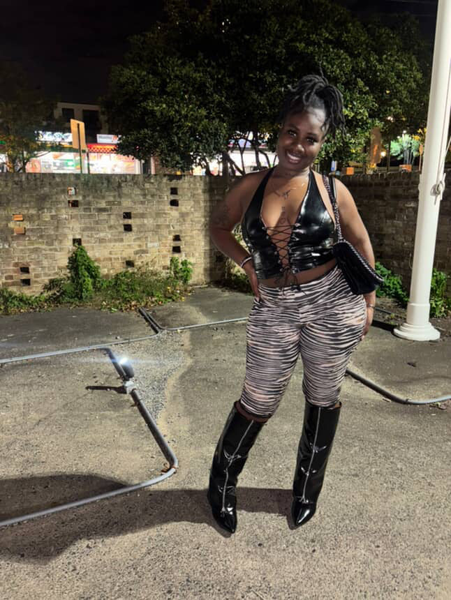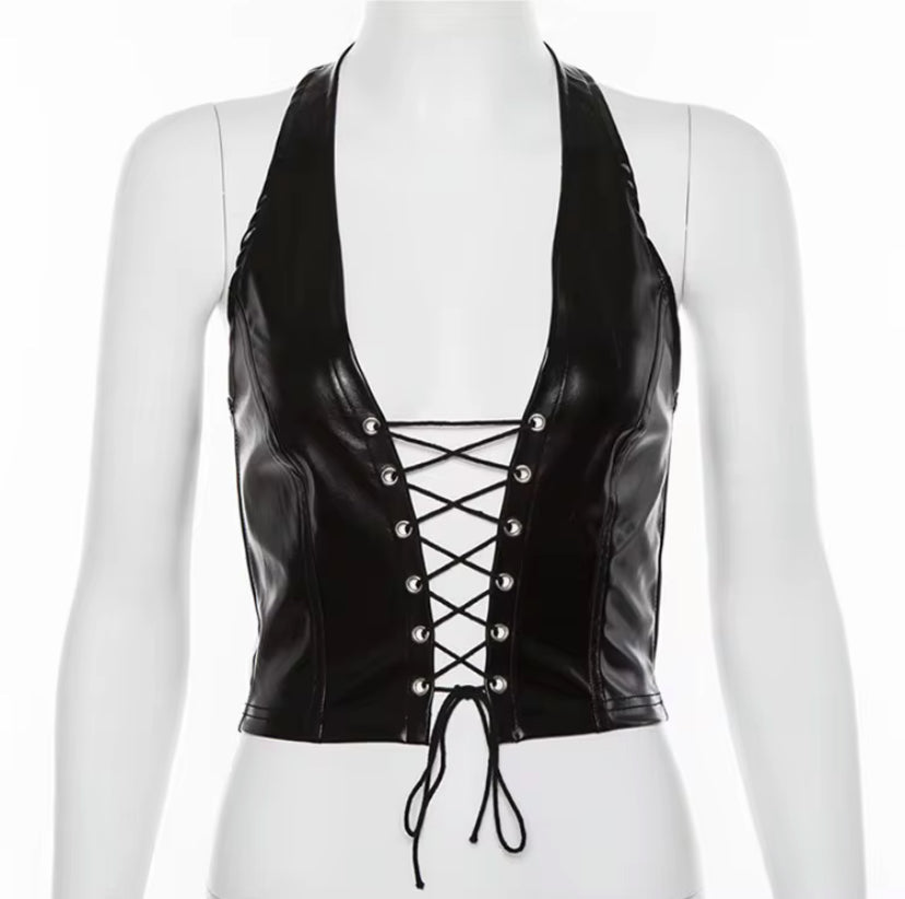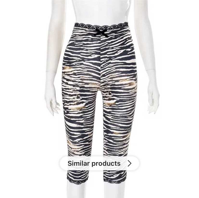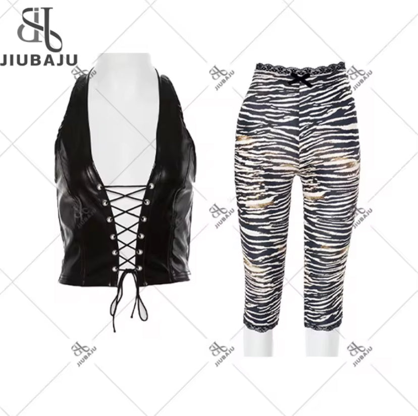 The ‘Xena’ set is a 2 piece set, leather tie up halter top with zebra print knee length pants. Trimmed in black lace along the top of the pants and at the end of each leg.